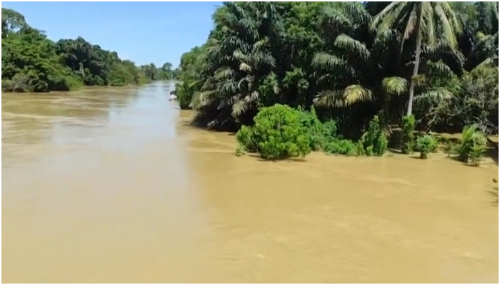 Kondisi Sungai Tabalong terpantau naik dengan warna air keruh kecoklatan macam susu coklat.